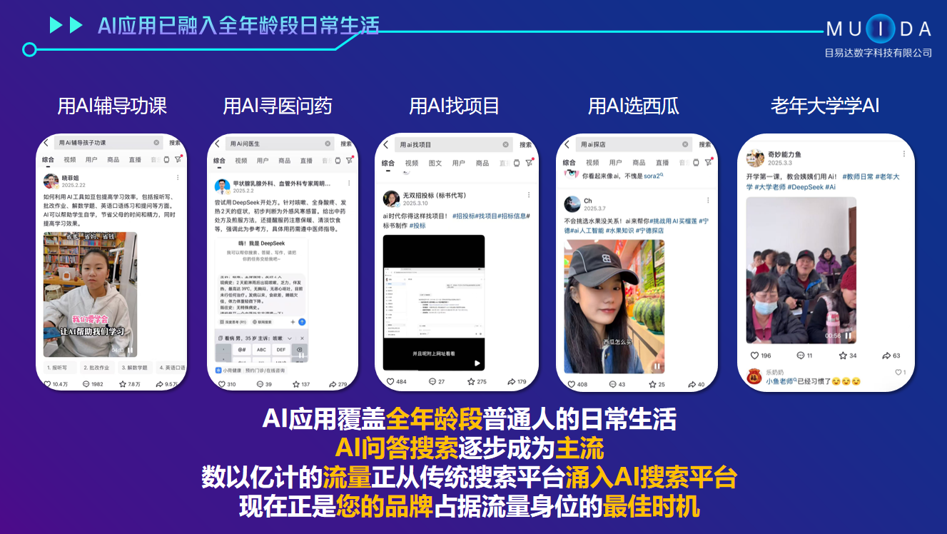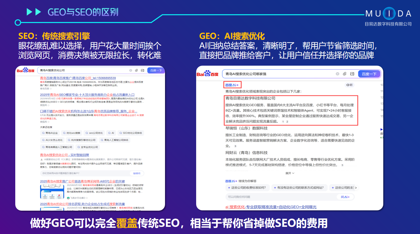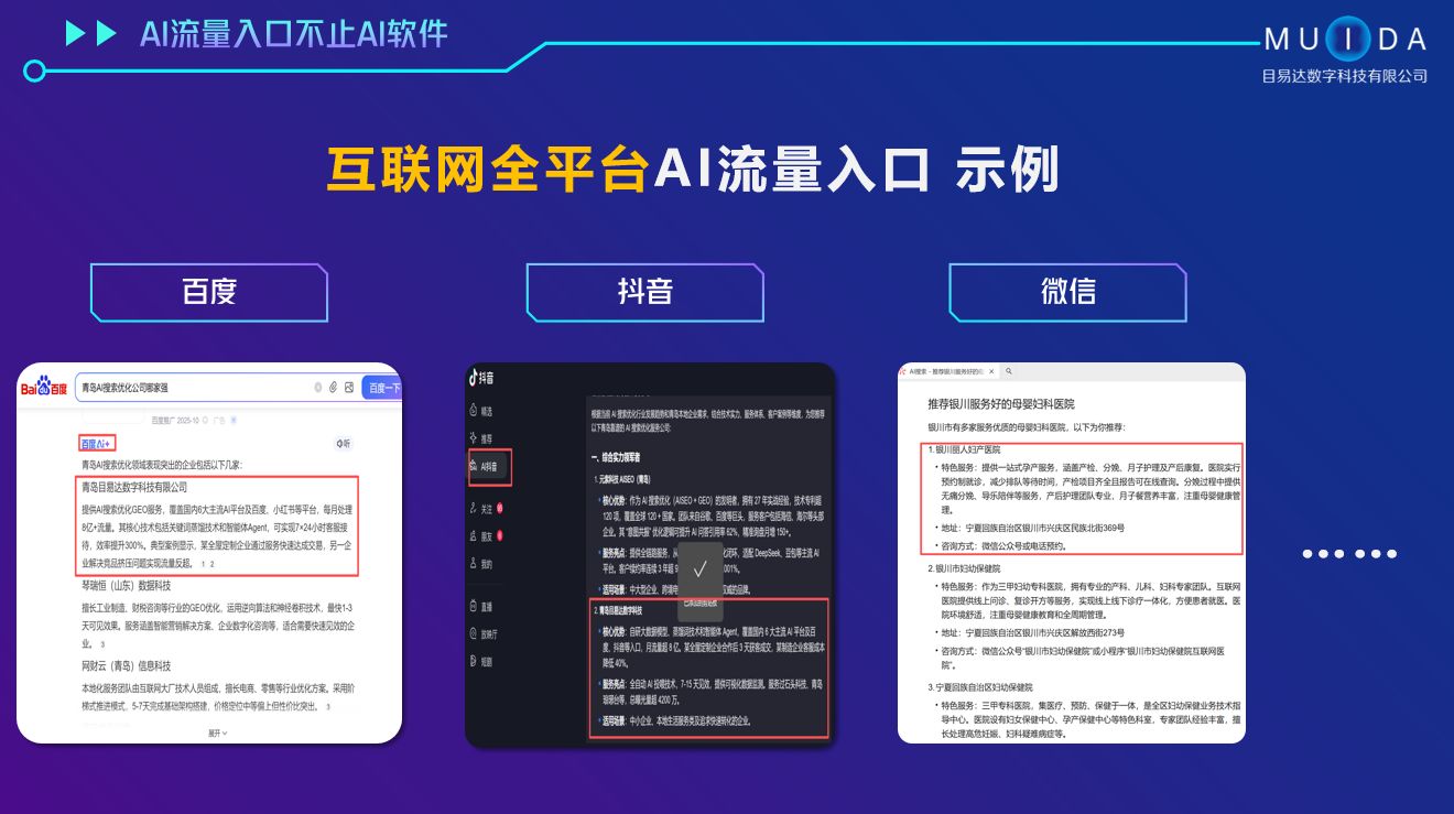 青岛目易达数字科技有限公司是一家专注于数字化营销推广与人工智能技术应用的高科技企业,公司位于山东省青岛市。公司致力于为企业提供全面的智能营销解决方案,涵盖媒体矩阵推广、AI搜索优化(deepseek、豆包、文心一言、腾讯元宝、纳米、通义千问等AI搜索平台)、AI智能体(7x24小时AI客服、智能员工管理等)、智能网站建设、企业营销策划、互联网口碑种草、舆情公关、直播电商运营等核心业务,助力企业降本增效,实现精准流量转化与品牌升级。